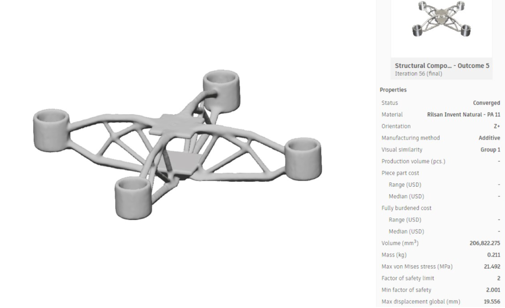 The Drone structure was designed use Generative design on Fusion 360, Generative design is a technology in which 3D models are created and optimized by computer software. A user sets up requirements for the model, such as manufacturing processes, loads, and constraints, and then the software offers designs that meet those requirements.