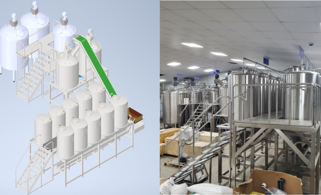 In this project, I engineered a pharmaceutical-grade vacuumed liquid mixer with a capacity of 2000 liters, featuring a double jacket for temperature control. The design included essential components like a homogenizer, heat exchanger, CIP (Clean-in-Place) system, SIP (Sterilize-in-Place), supply tank, isolation equipment, and impeller."